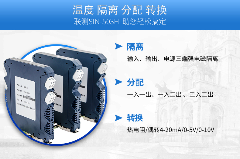將PT100等熱電阻跟熱電偶信號轉(zhuǎn)換成各種電流、電壓等標(biāo)準(zhǔn)模擬量信號,可以與PC機、PLC、DCS等實現(xiàn)工控監(jiān)測連接??垢蓴_能力強,遠(yuǎn)傳不受其他設(shè)備影響。輸入、輸出選擇范圍寬,準(zhǔn)確度高。電源可選擇,導(dǎo)軌安裝便于檢測與安裝。廣泛應(yīng)用于各種對溫度集中測量的監(jiān)控系統(tǒng)中。