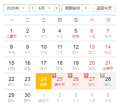 2020年6月25日(周四)至2020年6月27日(周六)放假調(diào)休,共3天。6月28號(hào)(星期日)正式上班。
