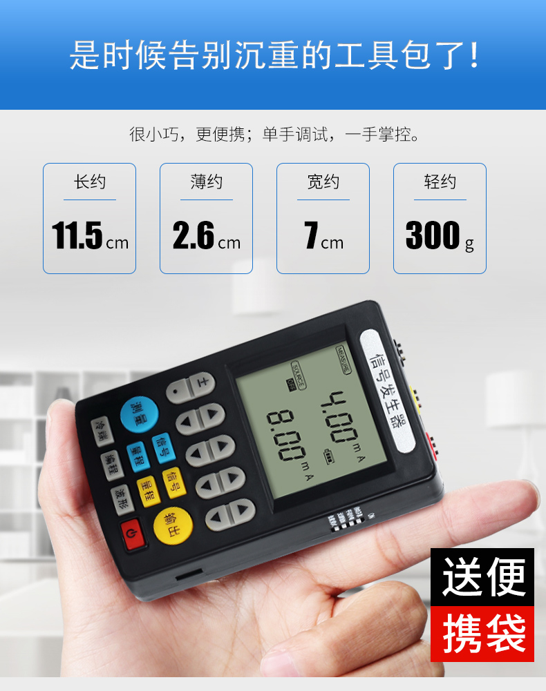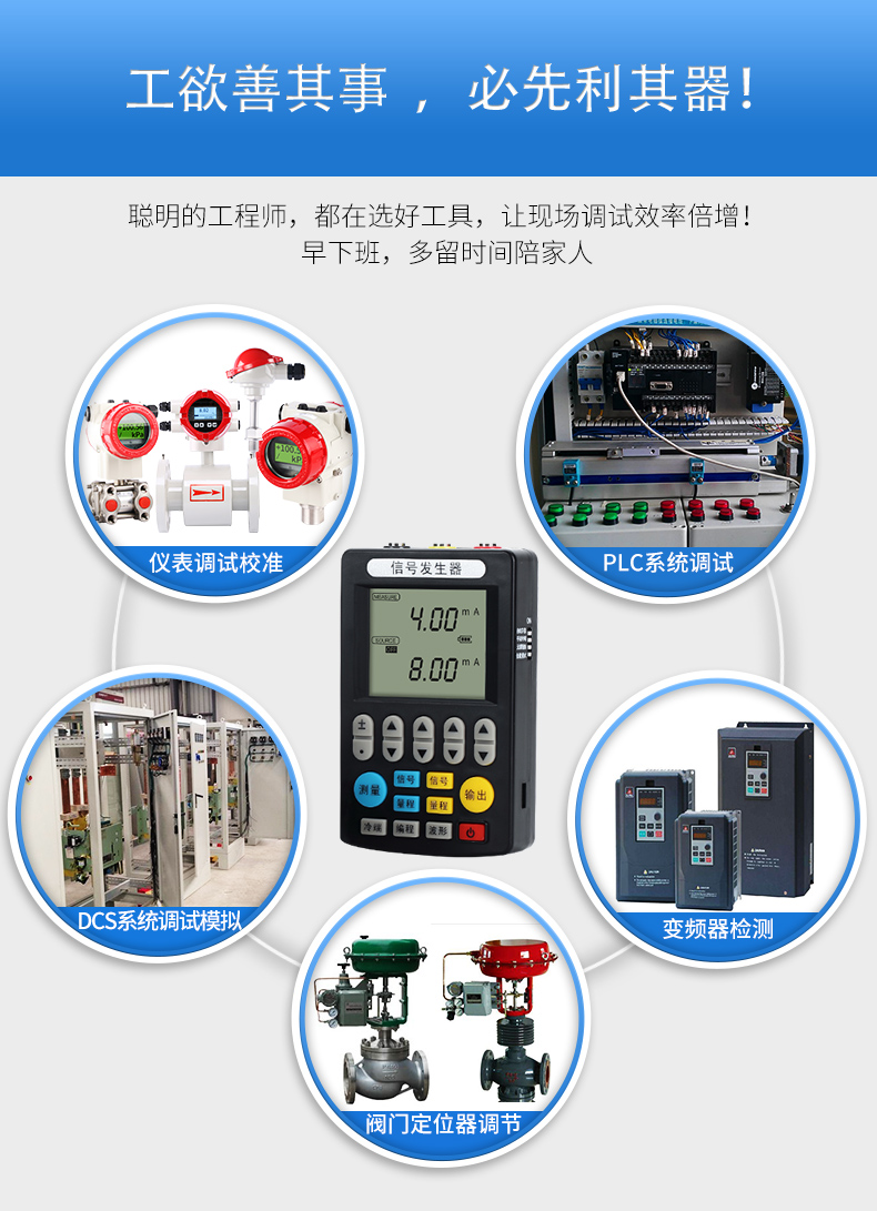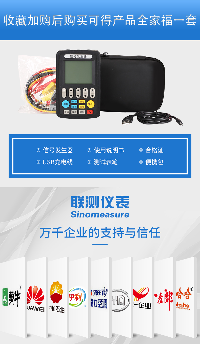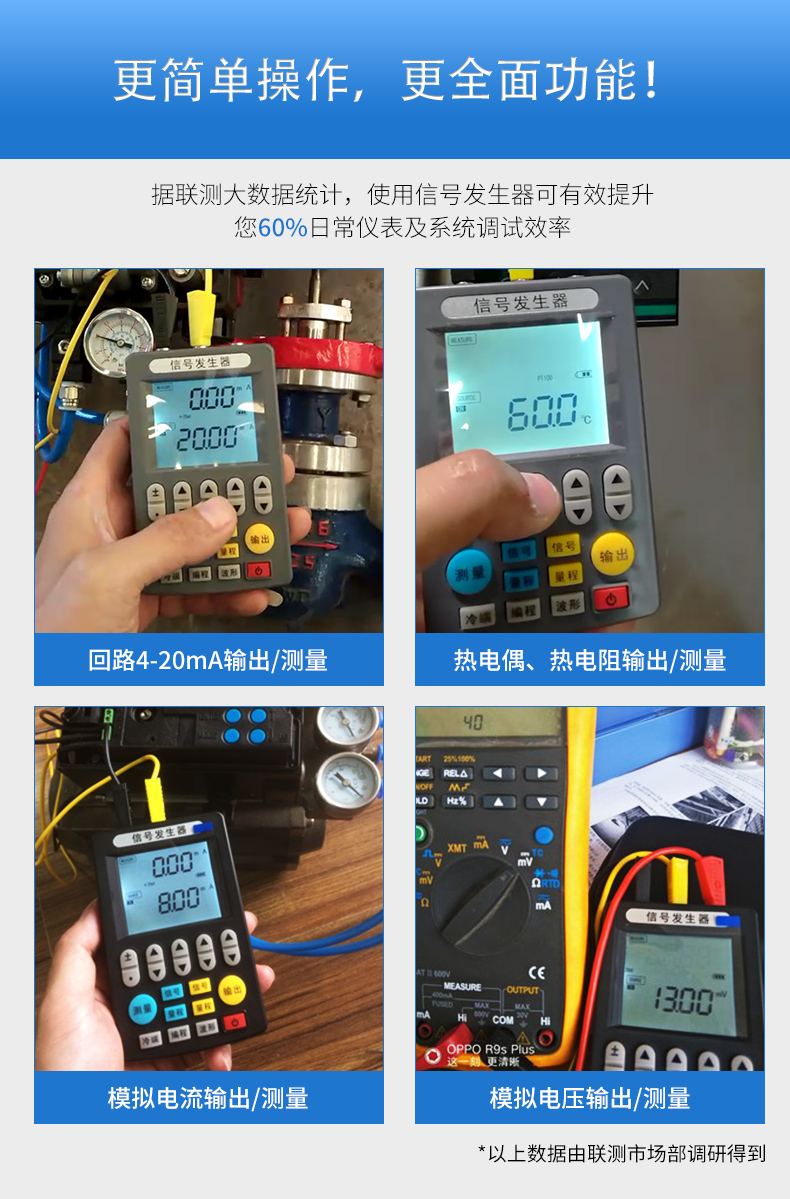 信號發(fā)生器具有多種信號的測量和輸出功能,包括電壓、電流、熱電偶,采用高清LCD液晶屏和功能分明的硅膠按鍵,操作簡單,待機時間長,精度高,并且具有可編程輸出的功能。