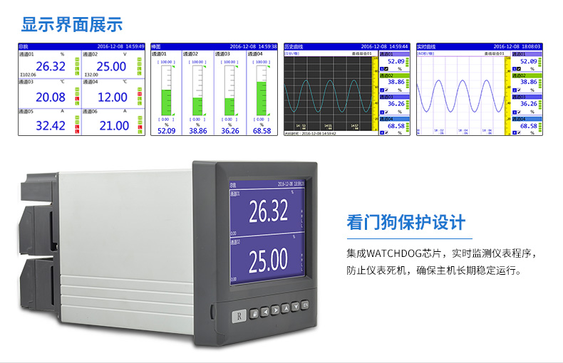 無紙記錄儀是將采集的數據/運算數據以時間為基軸記錄在儀器內部的存儲系統(tǒng)中,無消耗任何常用的記錄設施,如:紙張、筆墨。記錄在儀器內部的存儲數據,通過運算、模擬后顯示在液晶屏。常用顯示用液晶屏比較廣泛。在液晶屏屏幕上,可以顯示數字顯示、棒圖顯示、曲線顯示、報警列表等。無紙記錄儀采集的數據,常用的有:溫度、壓力、流量、液位、電壓、電流、濕度、頻率、振動、轉速等。