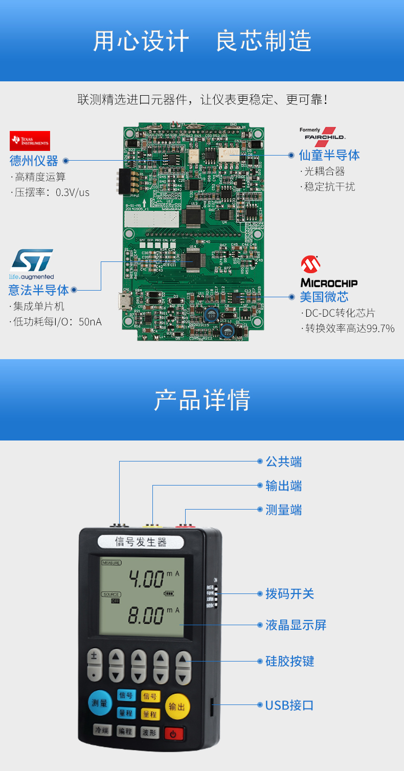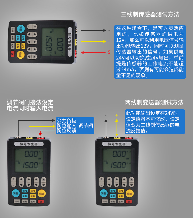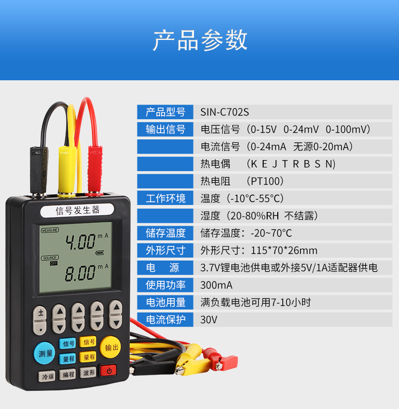 信號發(fā)生器具有多種信號的測量和輸出功能,包括電壓、電流、熱電偶,采用高清LCD液晶屏和功能分明的硅膠按鍵,操作簡單,待機時間長,精度高,并且具有可編程輸出的功能。