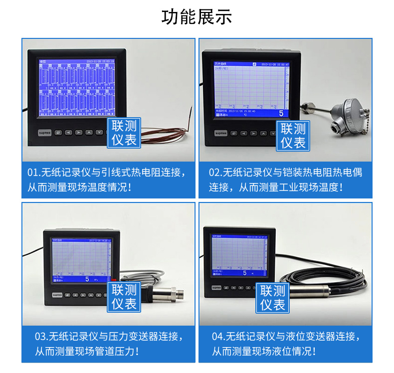 無紙記錄儀是將采集的數據/運算數據以時間為基軸記錄在儀器內部的存儲系統(tǒng)中,無消耗任何常用的記錄設施,如:紙張、筆墨。記錄在儀器內部的存儲數據,通過運算、模擬后顯示在液晶屏。常用顯示用液晶屏比較廣泛。在液晶屏屏幕上,可以顯示數字顯示、棒圖顯示、曲線顯示、報警列表等。無紙記錄儀采集的數據,常用的有:溫度、壓力、流量、液位、電壓、電流、濕度、頻率、振動、轉速等。