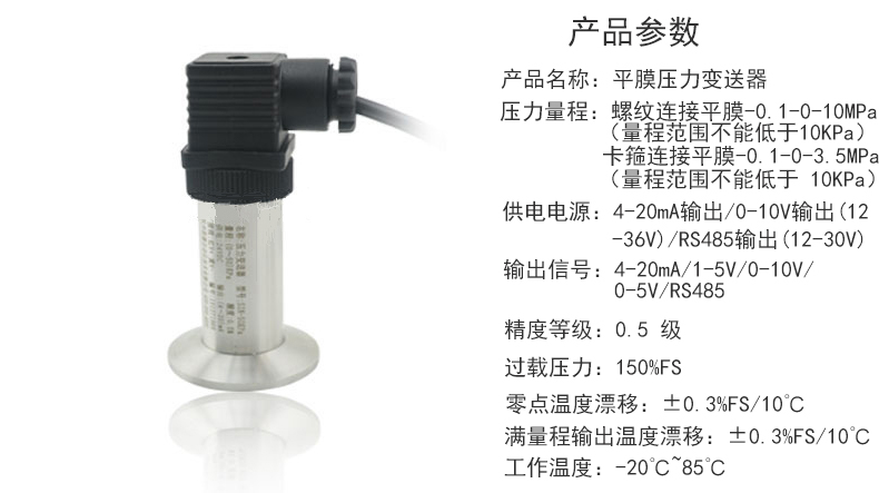 平膜結(jié)構(gòu)壓力變送器采用波紋膜直接感受壓力。傳 感器平膜片防止了污垢,不衛(wèi)生及粘稠液體堵塞等問題。 具有體積小、重量輕、長期穩(wěn)定性好等特點,廣泛應用 于食品、醫(yī)藥、衛(wèi)生及釀酒工業(yè)等行業(yè)。